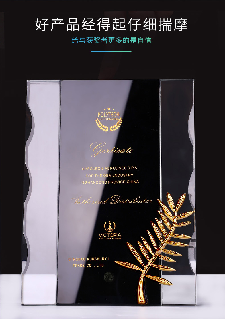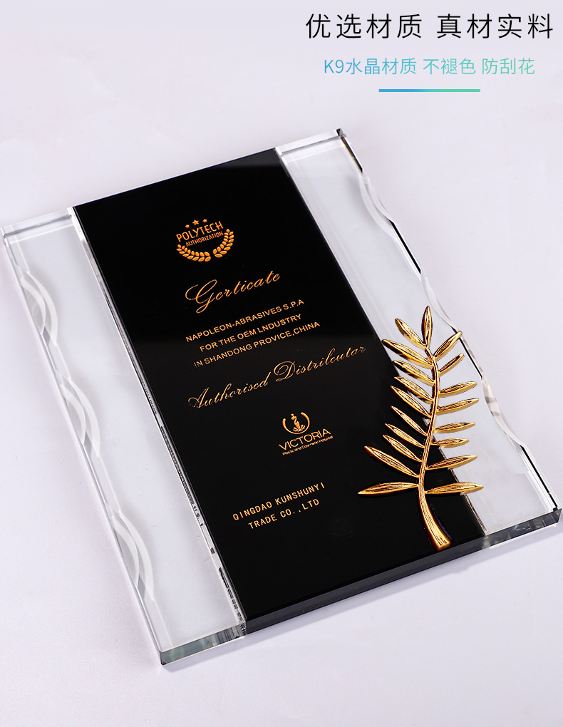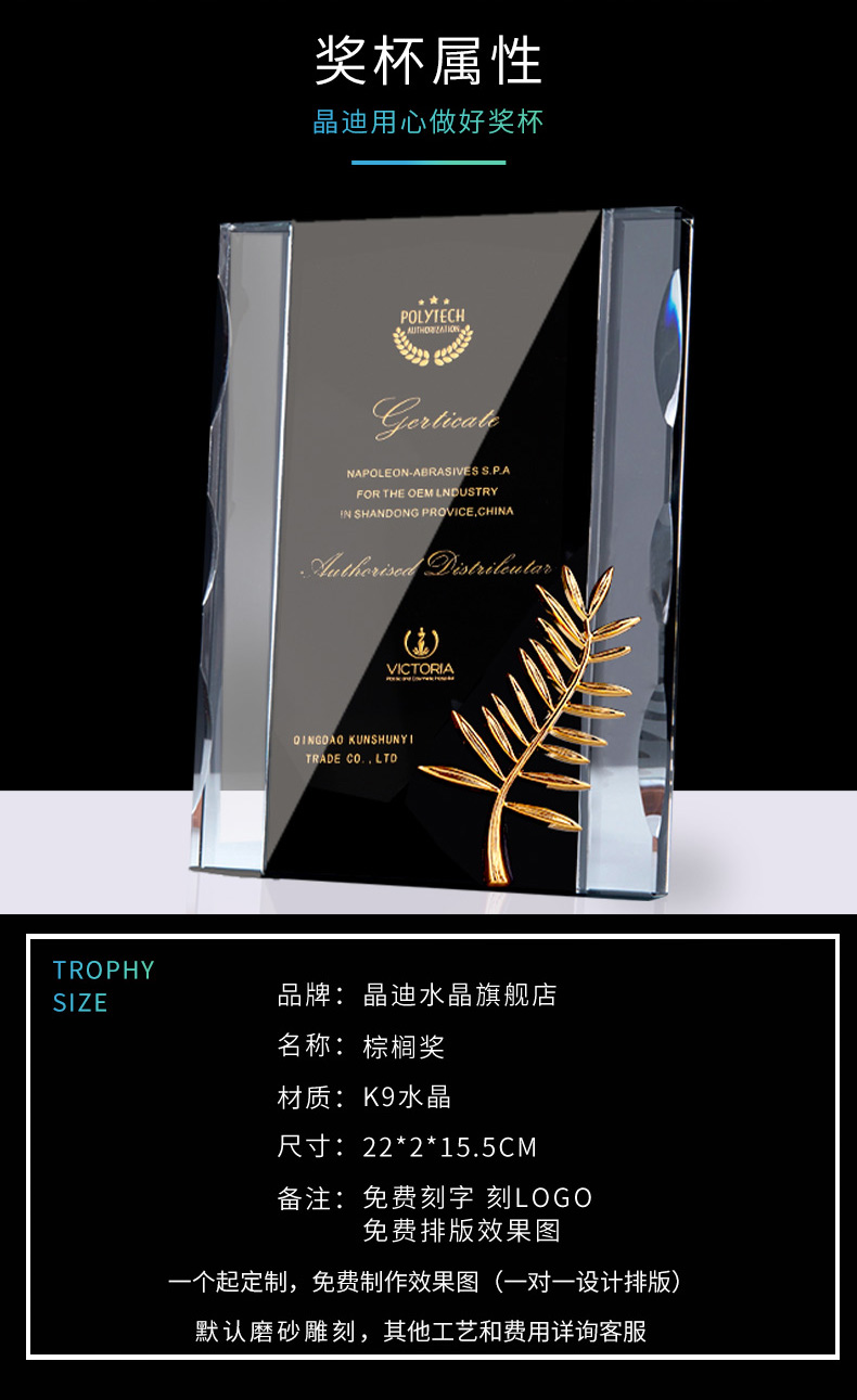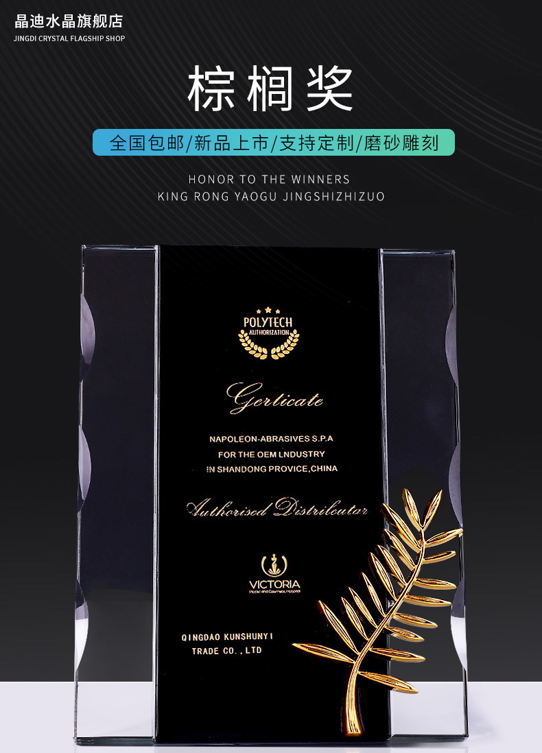 獎牌定制定做棕櫚獎定制授權牌榮譽牌匾代理經銷商加盟牌水晶獎杯